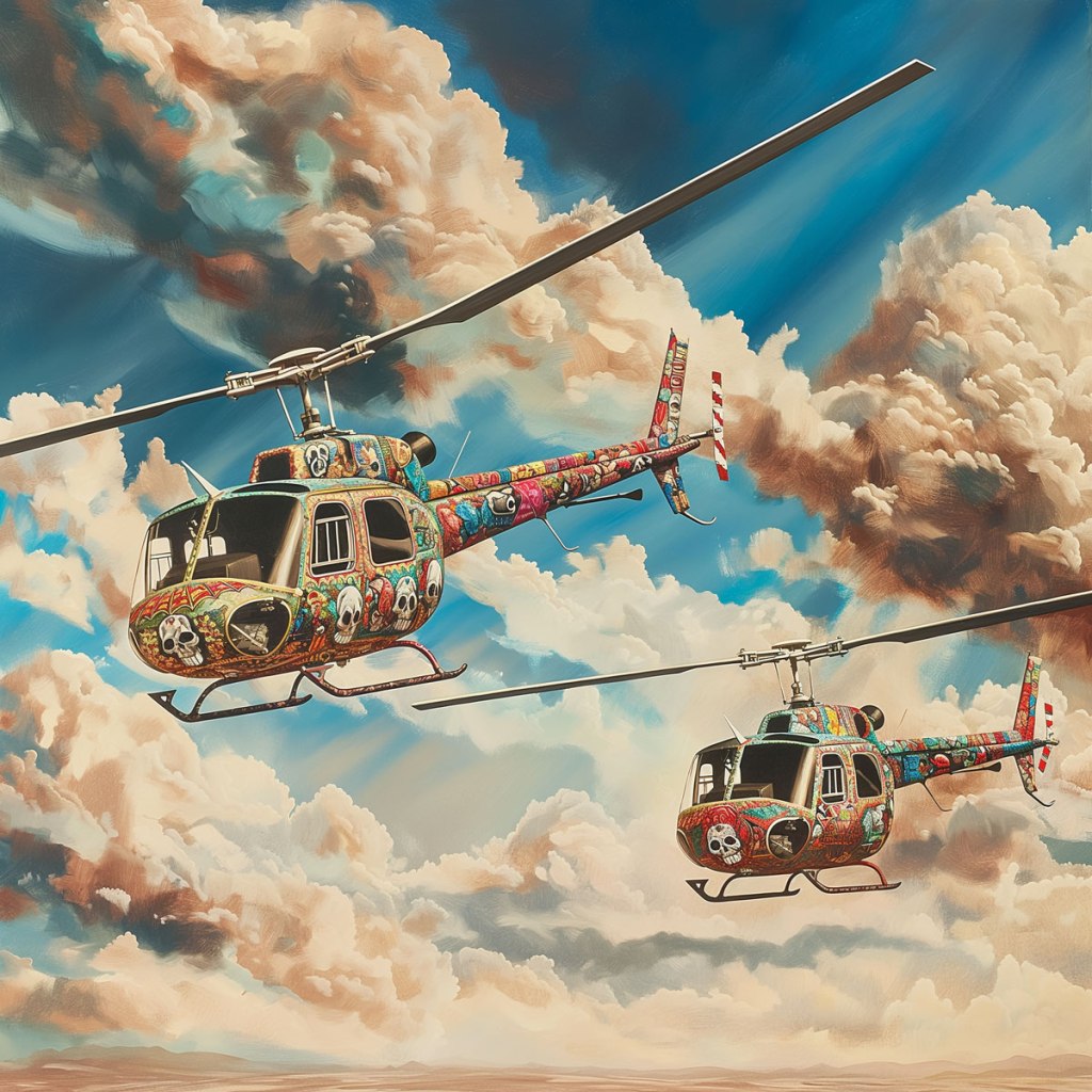 Below is a different take. No dinosaurs, but some Día De Los Muertos inspired street art adorns the helicopters. I love the colors, and how the skulls turned out on the exteriors of the helicopters.