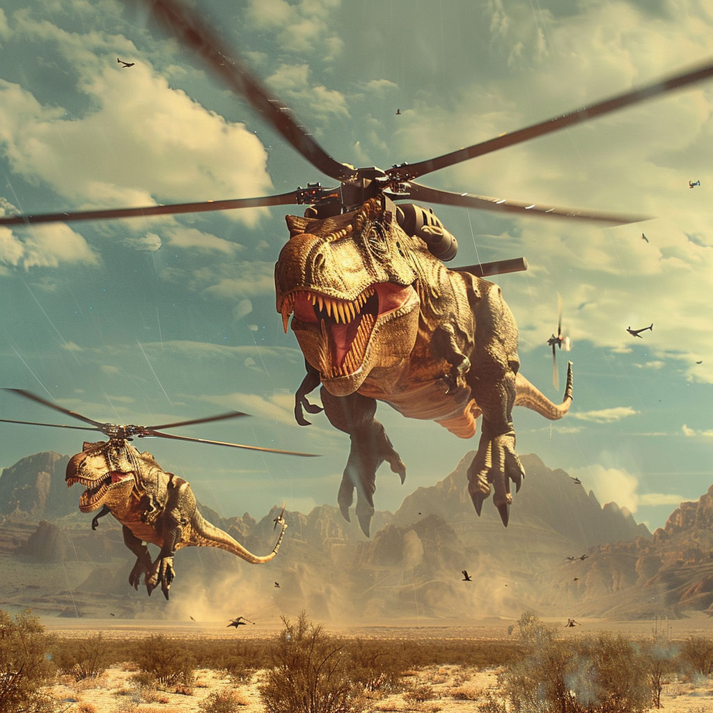 Yes, that is two dinosaur helicopters in the sky in the first picture. Something about the absurdity of that image makes me laugh every single time I see it. I wish I could tell you it was an easy piece to make using Midjourney, but it actually took a lot of playing around with prompts and varying things. There were also probably a hundred images that just didn’t work. As advanced as the technology may be, it was constantly putting propellors where they shouldn’t be, getting the dinosaurs wrong, or some other detail that just made it a fail. If you were to scrutinize the picture above, there are still a few things that are off, but I really like it as is.