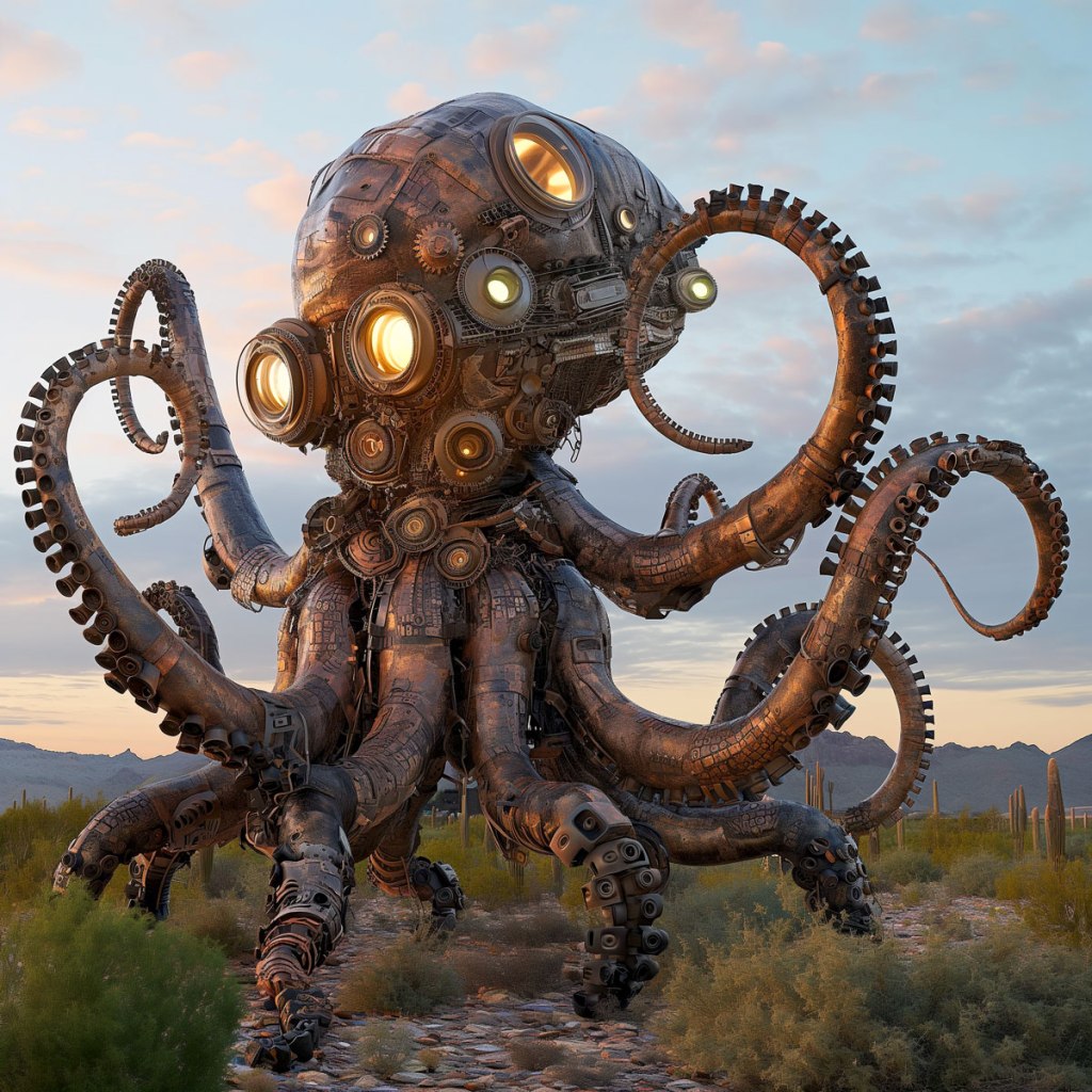 In the heart of Nevada’s vast desert, a unique creation roamed – OctoExplorer. An atomic-powered mechanical octopus, unlike anything the world had ever seen. Created by a genius inventor, OctoExplorer was designed to withstand the harsh desert conditions and uncover its hidden secrets.