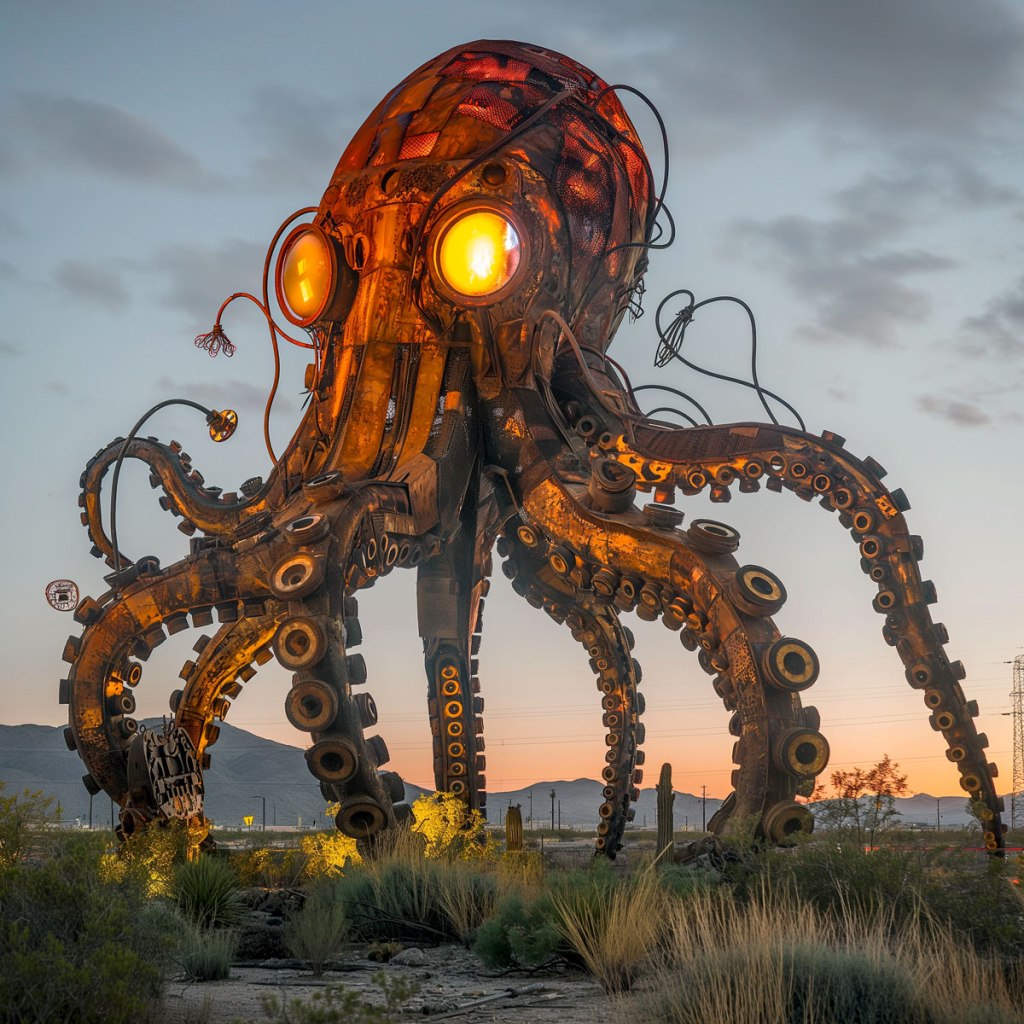 In a vast, sandy desert, where every day was a blazing hot adventure, lived a unique creature known as the Tinker Tentacle. Unlike any animal you’ve ever seen, Tinker Tentacle was a mechanical octopus made of metal and gears, looking like it jumped right out of a steampunk comic book. Its creator had built it to explore and find hidden treasures in the endless sands.